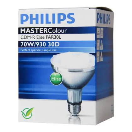 CDM-R Elite are compact discharge lamps equipped with reflectors with a very good lumen maintenance from the first to the last use. With their E27 base, Philips CDM-R Elite 70W 930 E27 PAR30L 30D can be easily integrated into luminaires, and allow you to replace your old inefficient halogen lamps. With a long average life of 15000 hours, Philips CDM-R Elite 70W 930 E27 PAR30L 30D halogens are economical and do not require frequent replacement.
